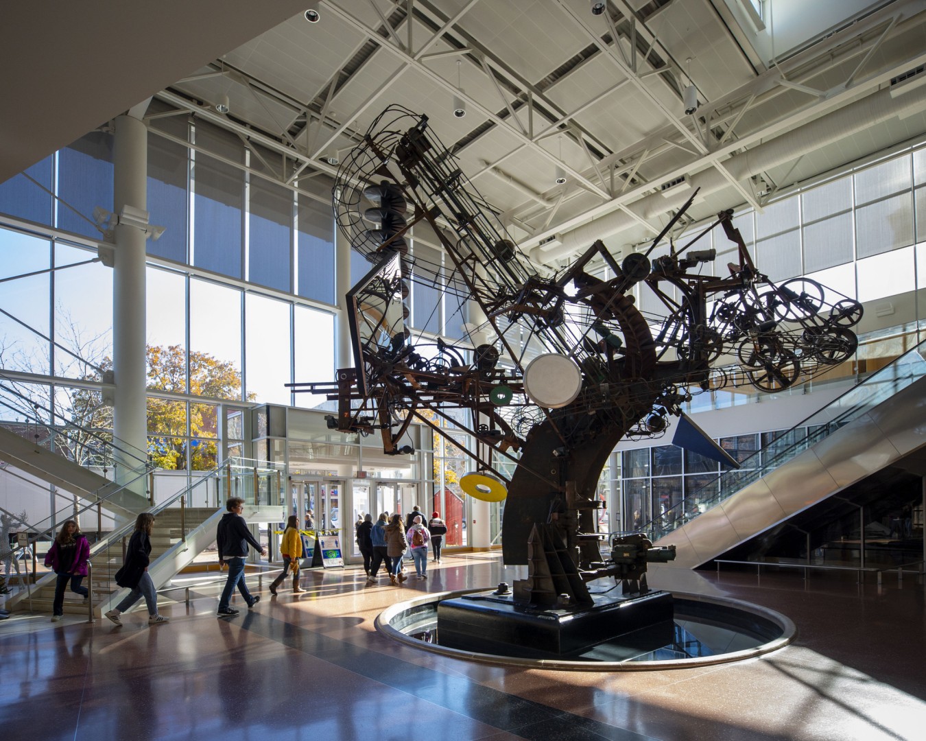 Tinguely’s Chaos was to be the focal point of a new downtown gathering place known as The Commons. The Commons itself was part of the larger Commons Mall that covered two city blocks. Architect Cesar Pelli, then a partner in Gruen Associates, designed the Commons Mall and recommended Jean Tinguely to create a “clock-like” sculpture. Pelli envisioned The Commons as an American version of an Italian piazza, a place that draws people together to meet, talk, watch, and listen.