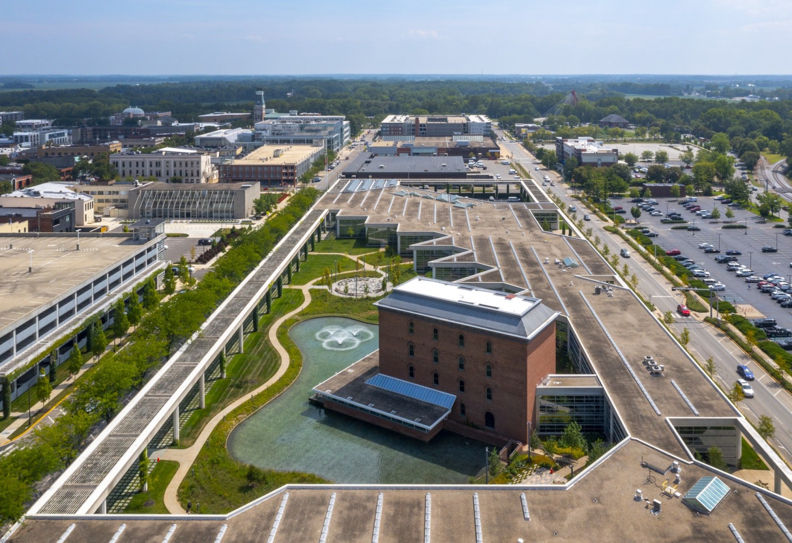 The corporate offices are built on a three-block plot of land that formerly served as a rail yard in downtown Columbus. As part of its distinctive construction, Roche built the new structure around the original Cerealine Building, which once served as Cummins’ first factory and administrative offices.
